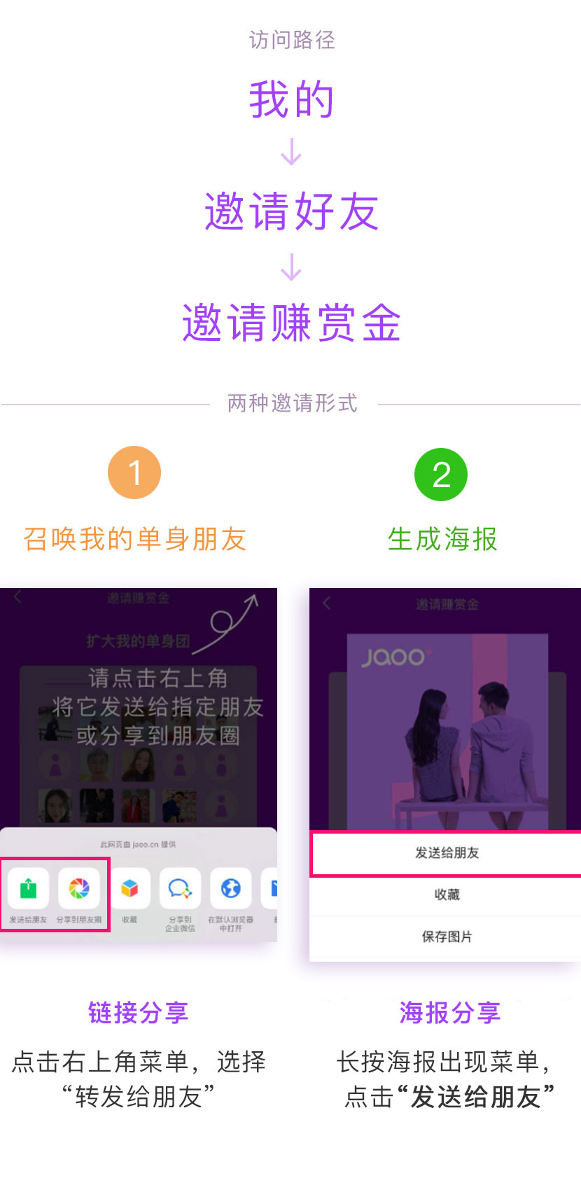 1. 通过JAOO单身团界面的两个分享按钮,将本平台链接或者生成的二维码海报,发送至微信内的单身朋友、单身群或者朋友圈,对方通过此来源进入JAOO注册即可成为你的单身团成员;